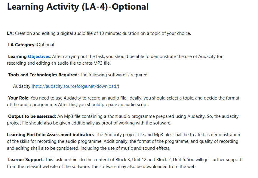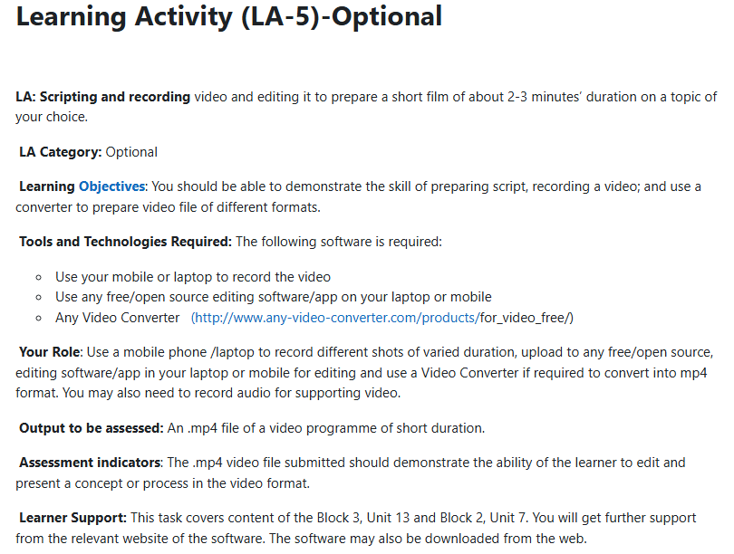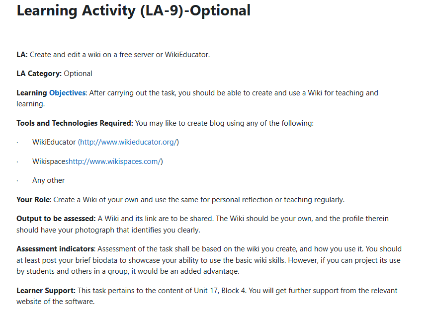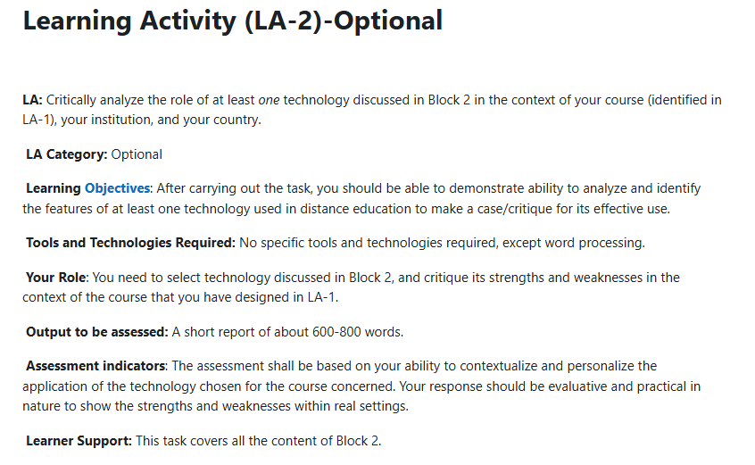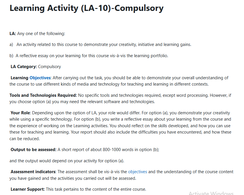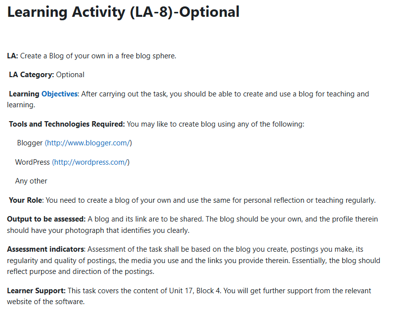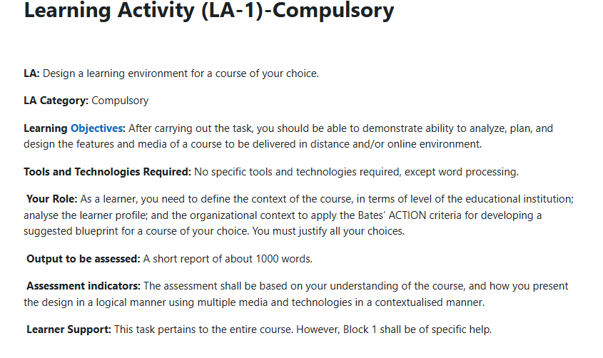 A Learning Portfolio is a set of activities designed in the context of the four Blocks of MDE-518: Educational Communication Technologies. We have categorized the Learning Activities (LA) as compulsory and optional. You have to complete all the compulsory LAs and work on any six (6) of the optional LAs.
